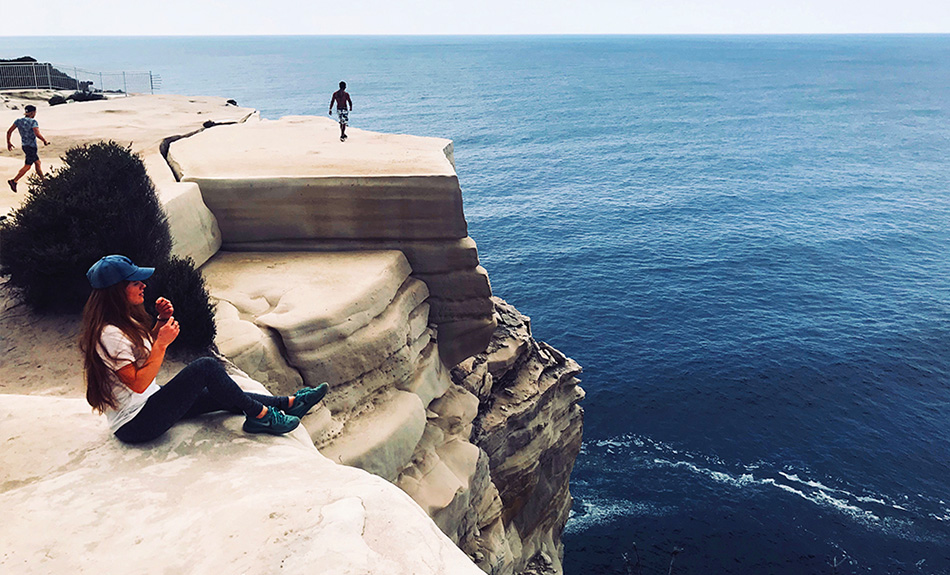 崖淵で逆立ちをしたり、足をブラブラ座ったり、