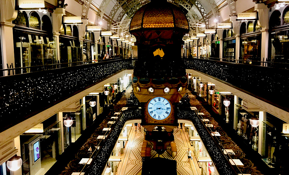 まずは、シドニーに来たら1度は行っておきたいクラッシックな内装のショッピングアーケードQVB。ここのアーケード内もすっかりクリスマス。